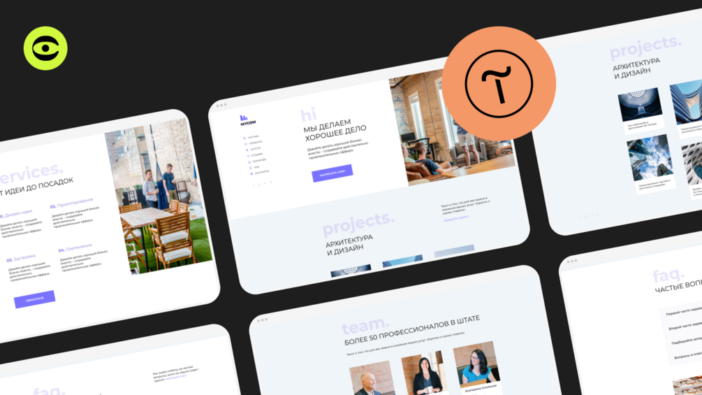 A universal landing page template on Tilda that is perfect for demonstrating a company: Projects, Services, Clients, Team, FAQ, and Contacts. It contains a non-standard fixed side menu, projects in zero, in the popup, and transfers the Show button's functionality to the zero block button.